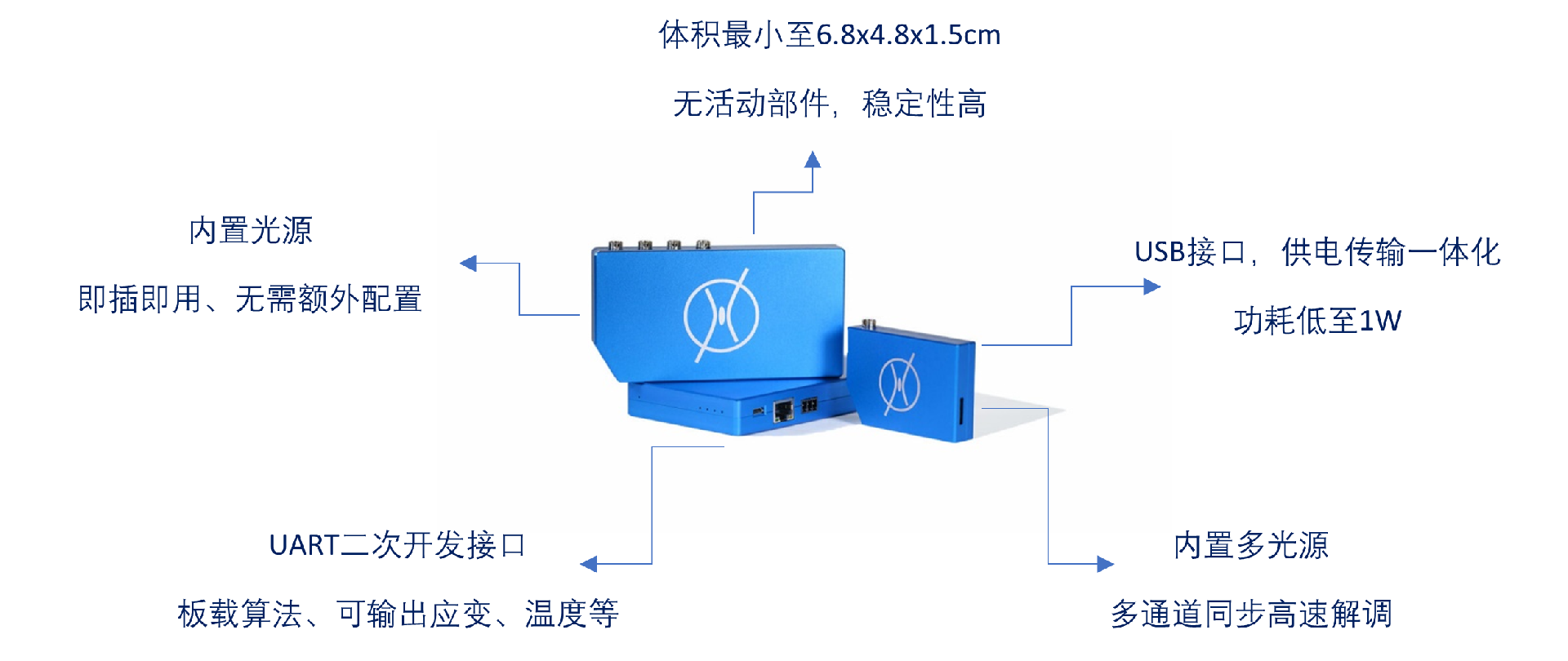 微型光纤光栅解调仪X100,X400基于德国FiSens公司独有的衍射光栅和宽带光源,将传统解调仪所需的所有元器件集成到一个小空间内,是的FISens系列产品具有重量轻、尺寸小、功耗低、性能稳定、性价比高等优势。